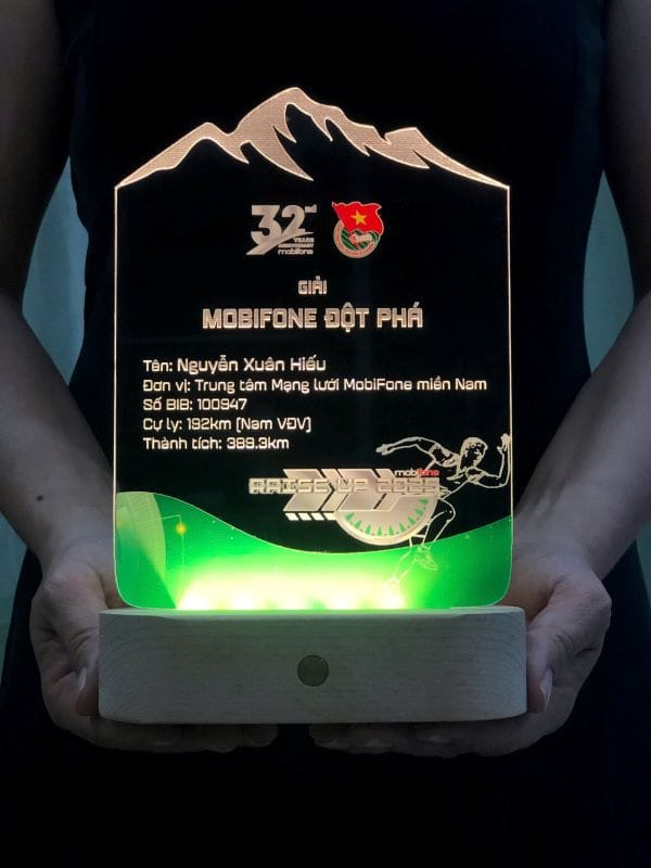 Đèn LED kỷ niệm chương khắc laser/ in UV: Mẫu Đa giác, Đế gỗ teak sử dụng pin/ điện