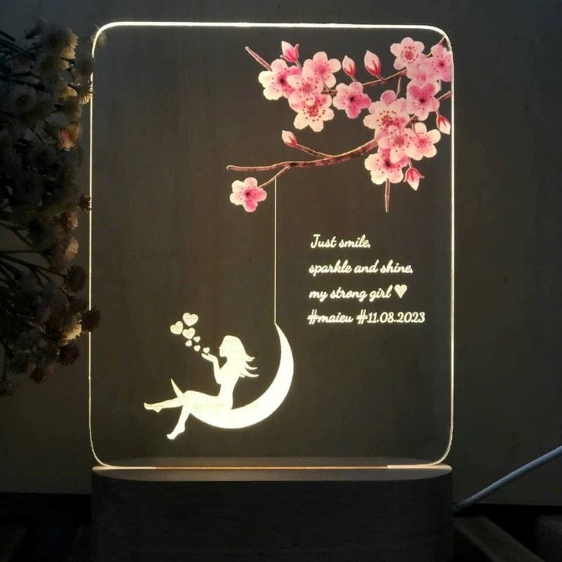 Đèn LED kỷ niệm chương khắc laser/ in UV: Mẫu in bông hoa 1, Đế gỗ teak sử dụng pin/ điện