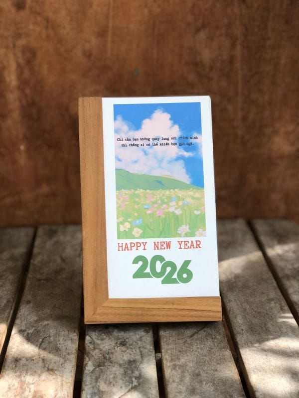 Lịch năm mới 2026 – Mẫu Hoa- đế gỗ ngang, khắc chữ / in logo theo yêu cầu